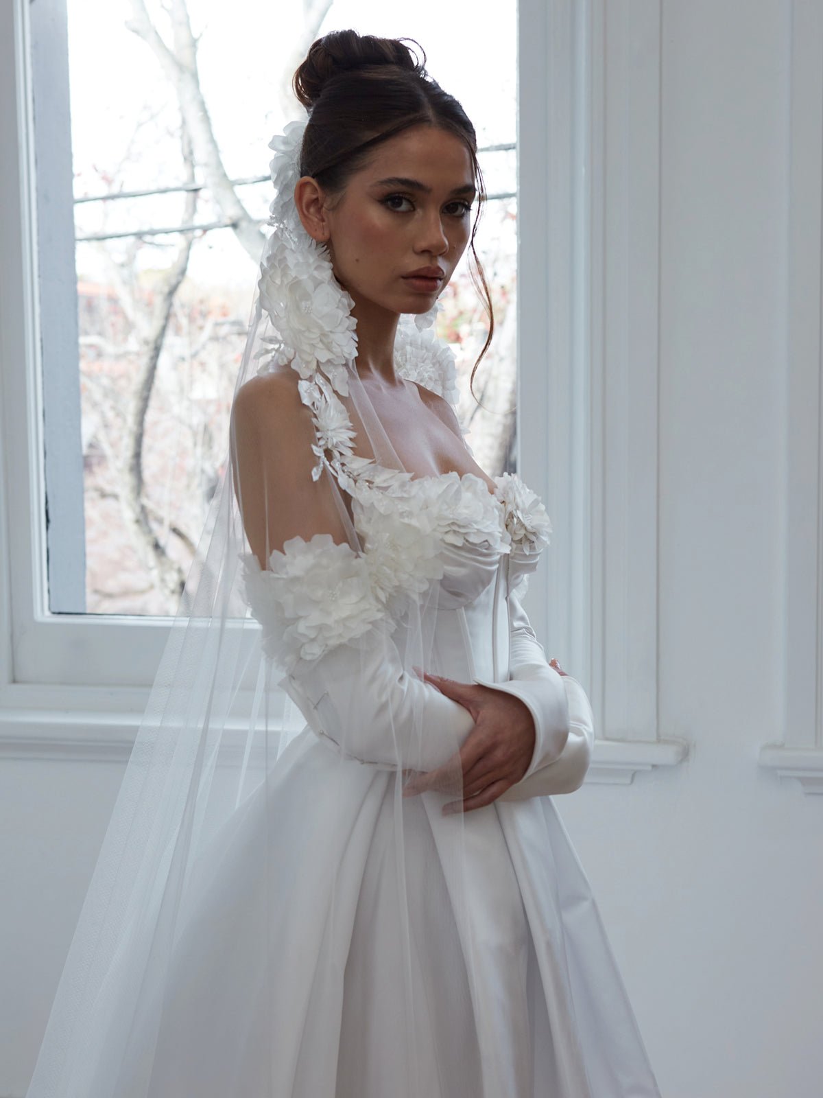 Using icy white satin, Ana Capri is an off the shoulder gown with separate long slim sleeves and a sumptuous split skirt. The boned bodice and sleeves are decorated with exquisite layers of hand cut silk petals constructed to resemble perfect white flowers, such as gardenias carnations and daisies. This intricate couture work also features on matching French tulle veil, the ultimate bridal embellishment.