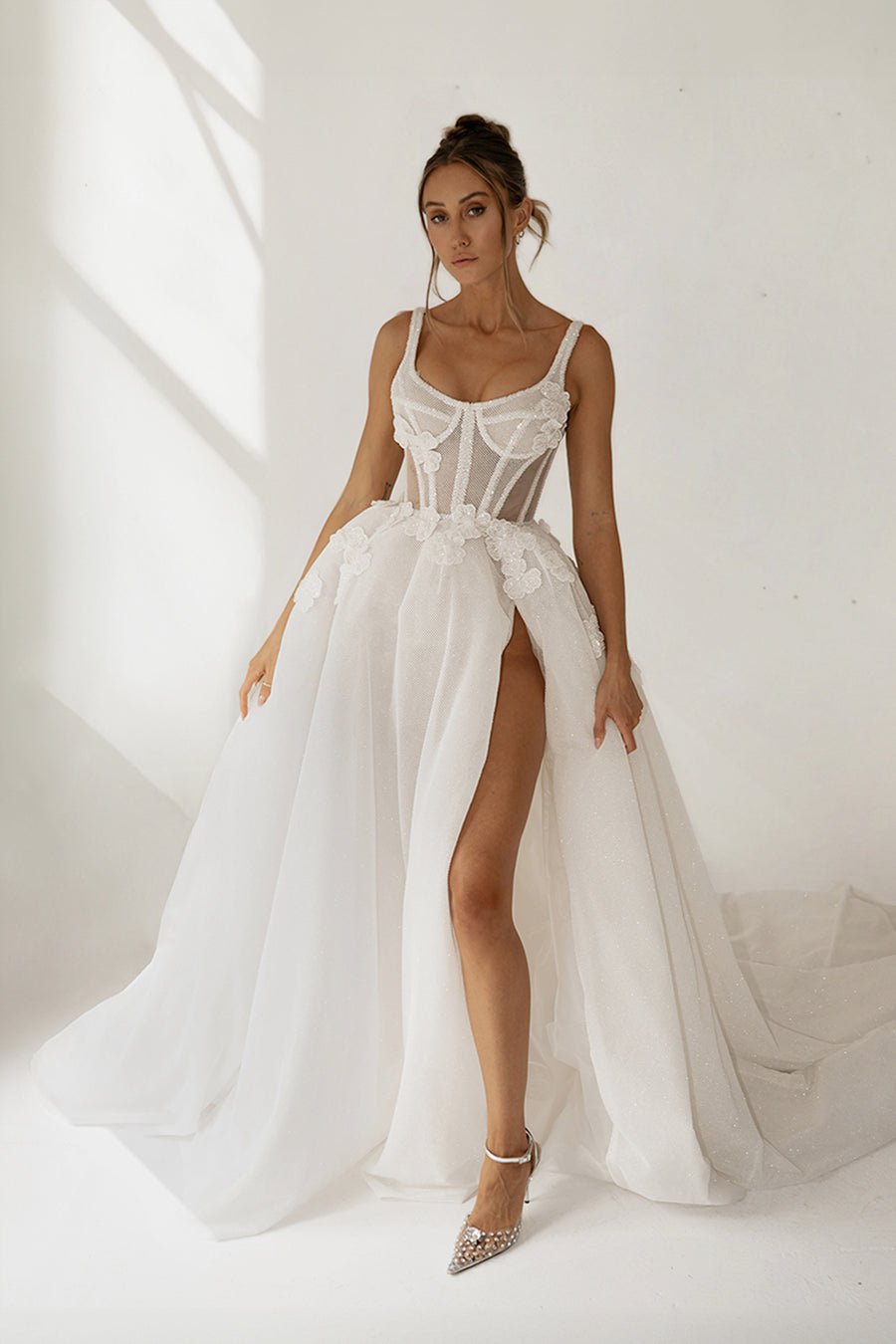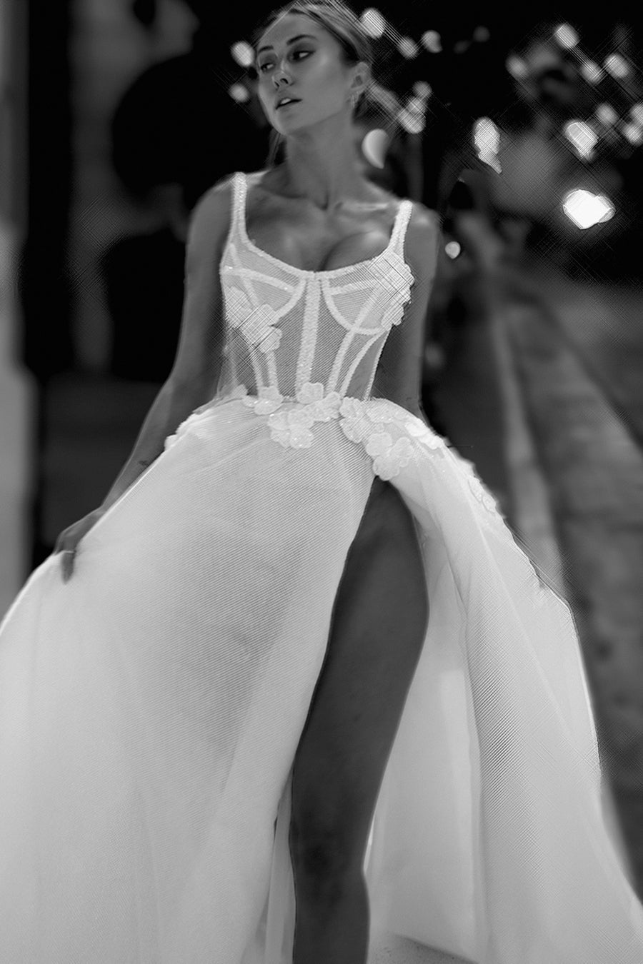 With a sheer mesh bodice, finely boned and encrusted with sparkling paillettes , this is couture construction at its finest. The sensual metallic mesh skirt is cut to reveal a long leg, scattered with sparkling hand sewn flowers at the waist and hips. The deftly cut bodice delivers a fabulous decolletage, resulting in a sensual gown that is also perfectly balanced.