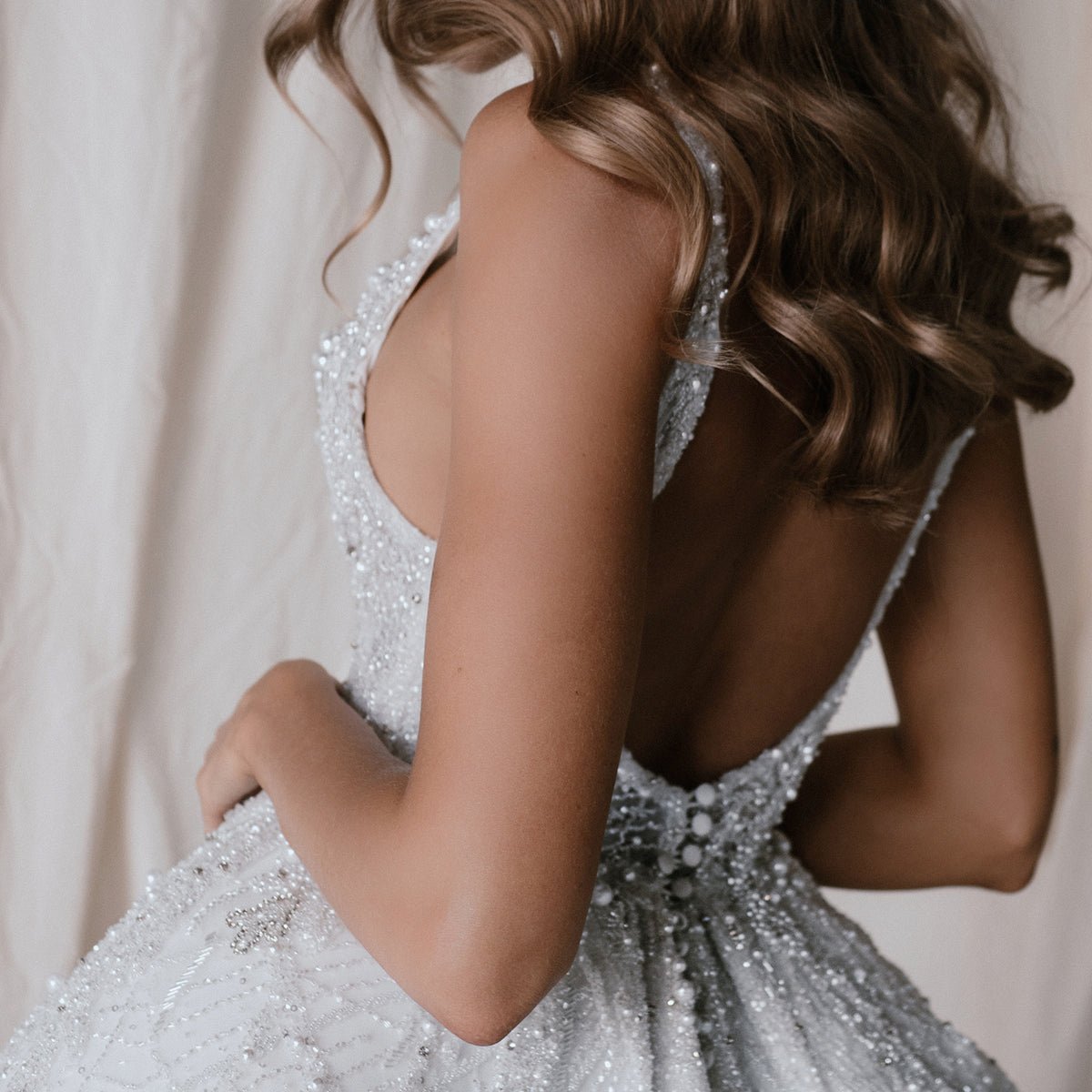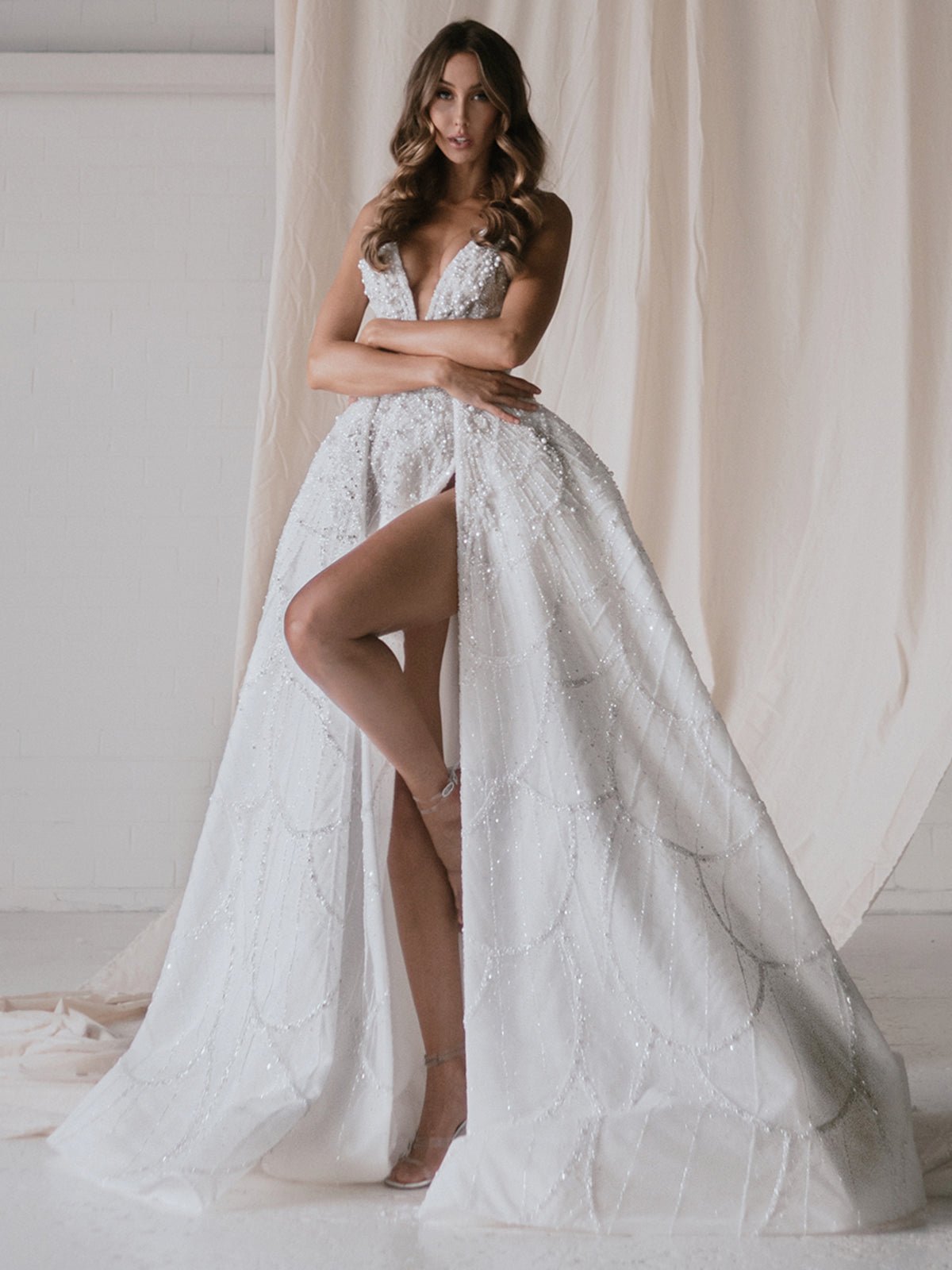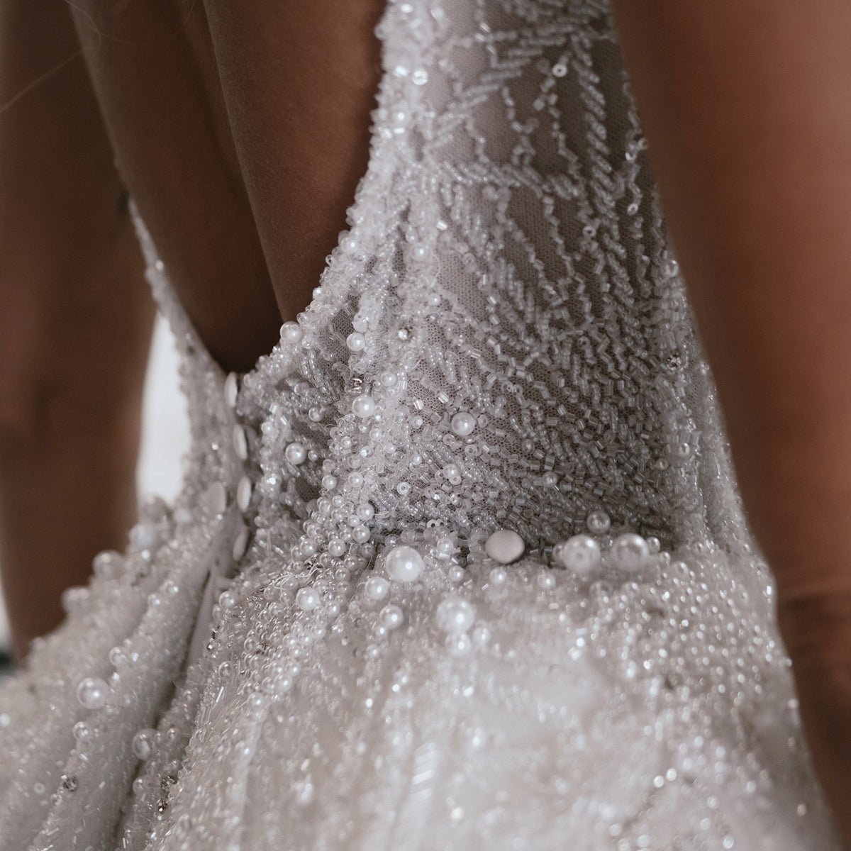 The Armandine resembles a shimmering lotus flower, revealing ever more beauty as it unfolds. An opulent, pearl encrusted plunge bodice cinches the waist beautifully, emphasising a voluminous split ball skirt in purest natural white, embellished with a cascading petal design in sparkling, silvery sequins. The masterfully constructed bodice features a plunge front and back, edged in exquisite pearl beading, a superbly tailored counterpoint to a dramatic, sweeping skirt. Soft folds of delicate silk gleam with garlands of crystal beading, dancing like sun rays, extravagant and unforgettable.