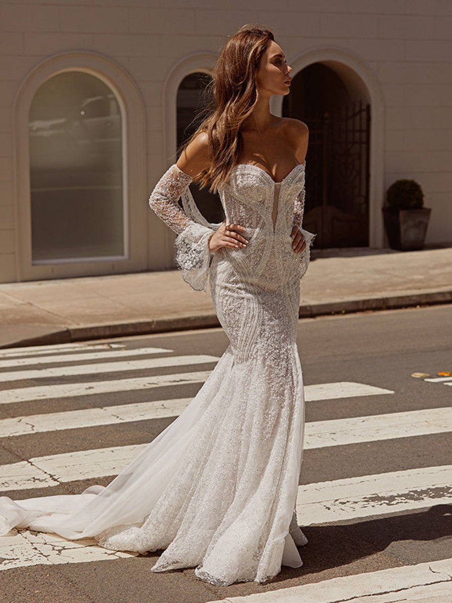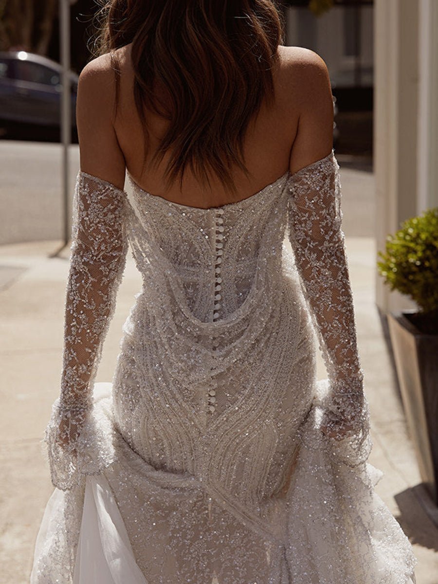 With a high-backed strapless bodice and silvery, beaded detachable sleeves with trailing cuffs, Bayle is finely boned and seamed to mid-thigh, ending in a romantic fishtail skirt. The button back is also swather in gleaming folds of beaded silk net, creating a beautiful, draped effect.