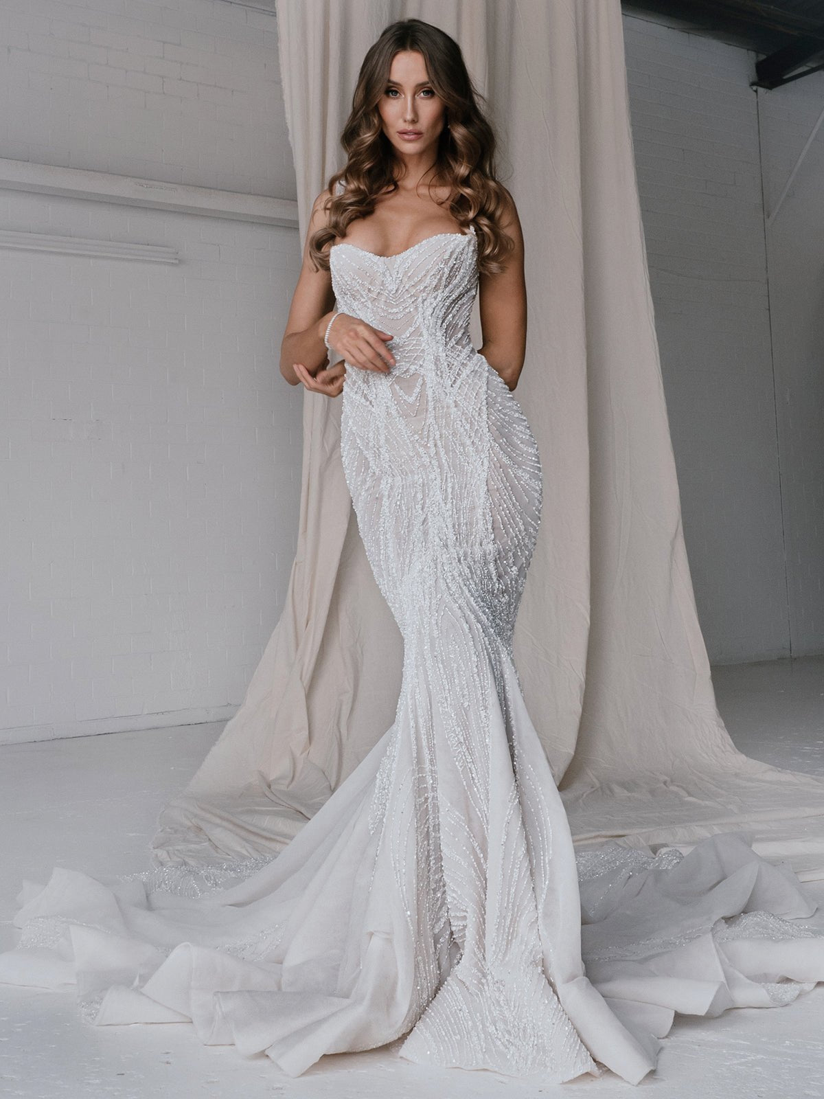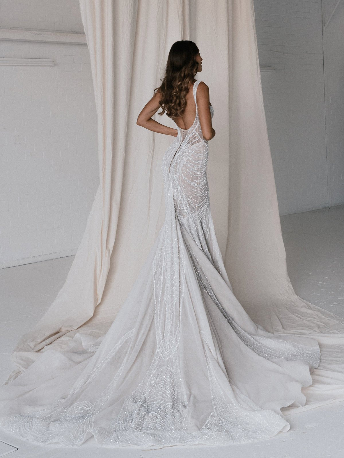 This strappy, sheer, and ultra-sensuous silk gown is lavishly beaded in undulating lines of crystal from bodice to hem, with a sumptuous train that flows into one seemingly liquid pool of loveliness. Elegantly skimming every curve, Bellamy eventually spills into a romantic, trailing fishtail, dazzling, opulent folds of creamy silk and shimmering beads.
