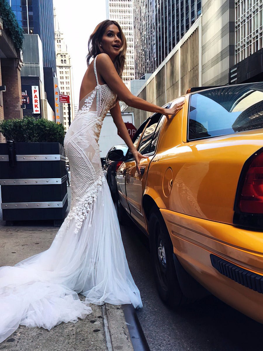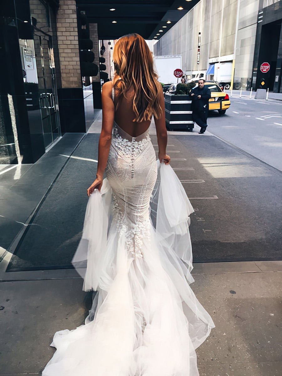 The plunging lace edged bodice of Cadencia creates a stunning decolletage and a low sexy back. The intricate embroidery continues to the knees, finishing with clusters of lace flowers (also echoed on the lower back) where it then spills into a train of featuring layers of delicious silk tulle.