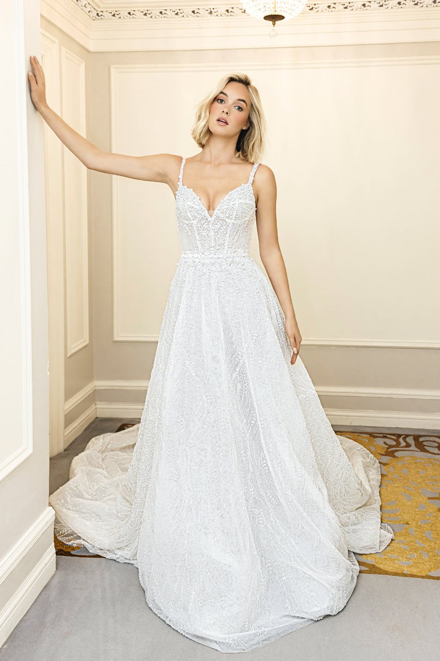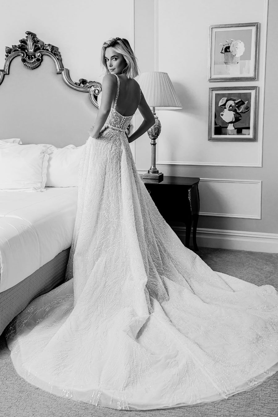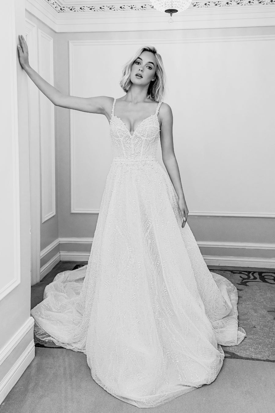 Clio features all the hallmarks of the quintessential Pallas bridal gown: a classic corset bodice, sensational boning, a narrow belt, buttons tracing a line on the lower back, lavish fronds of pearl embroidery , and a dramatic skirt billowing behind.