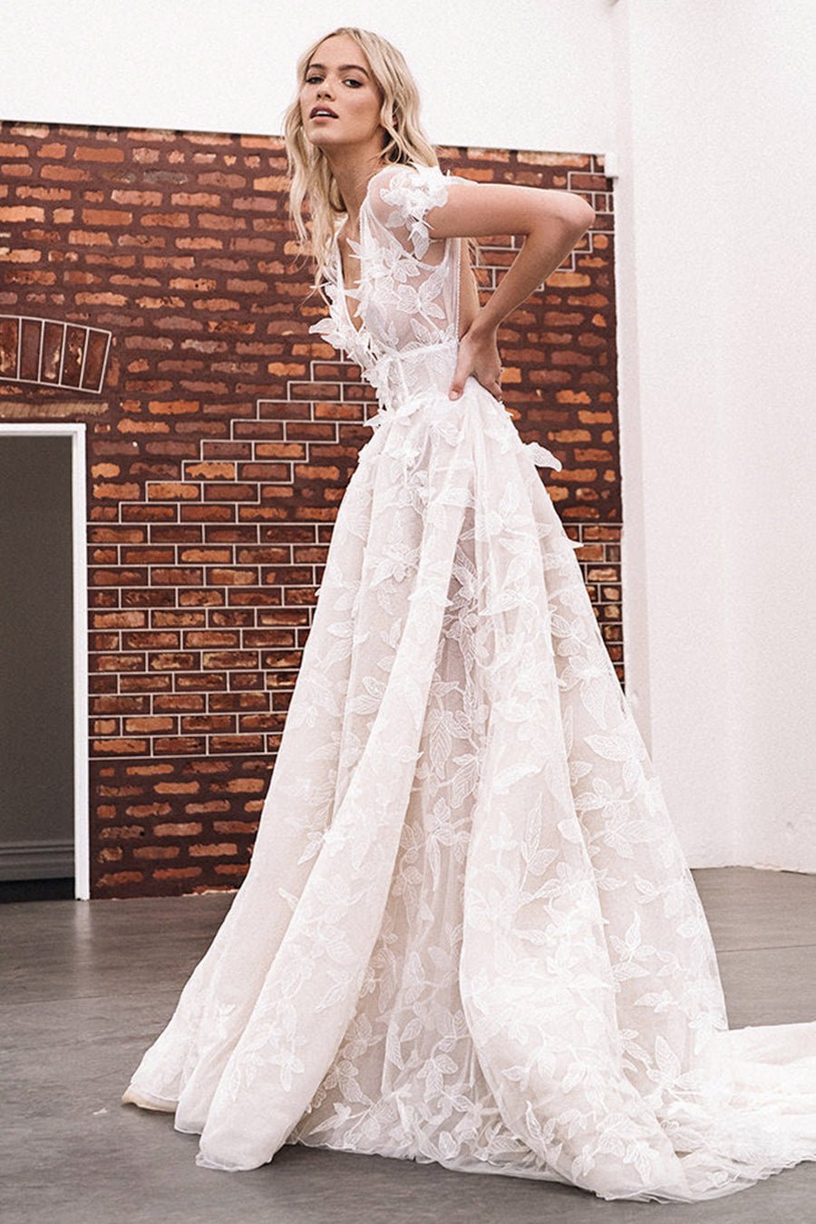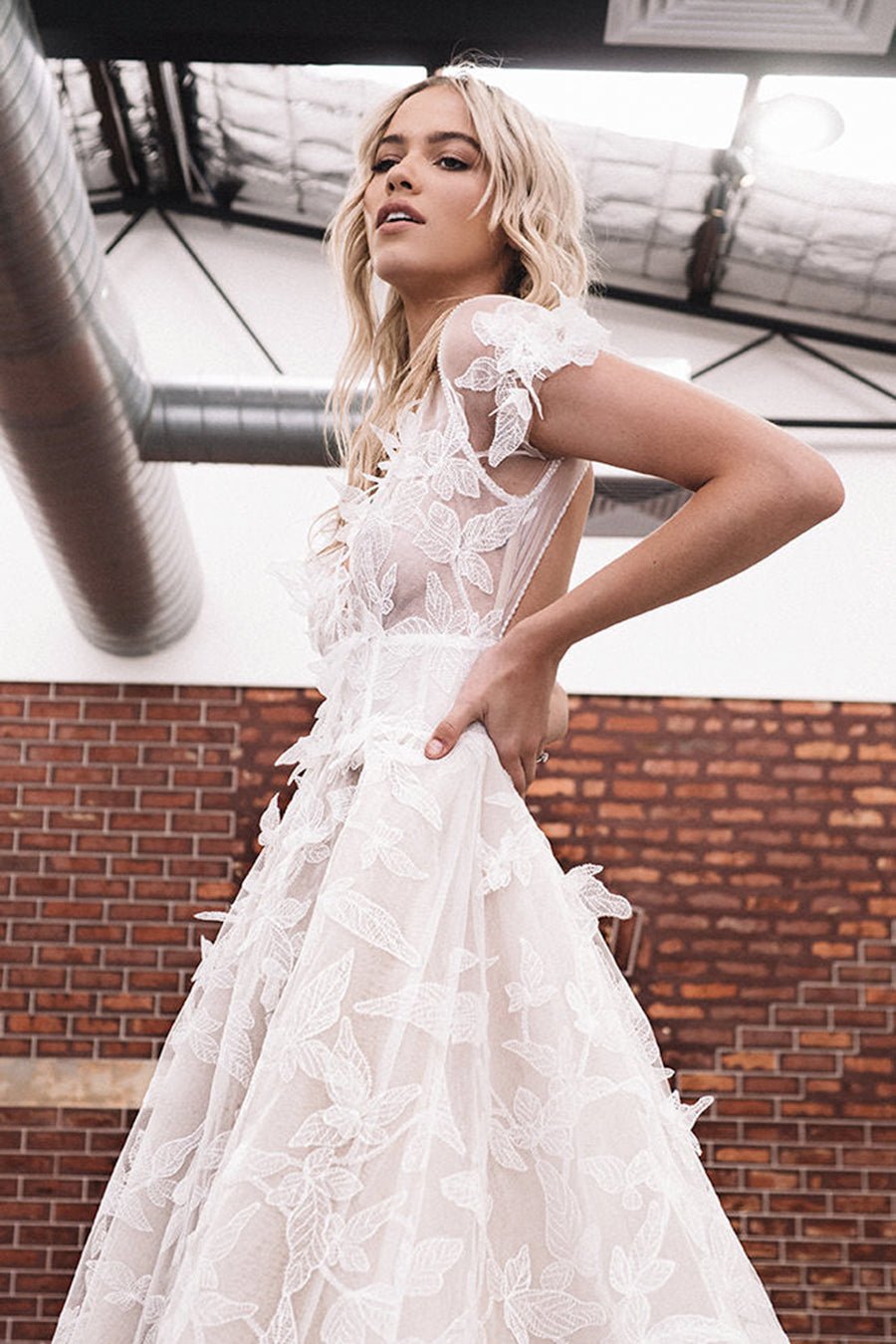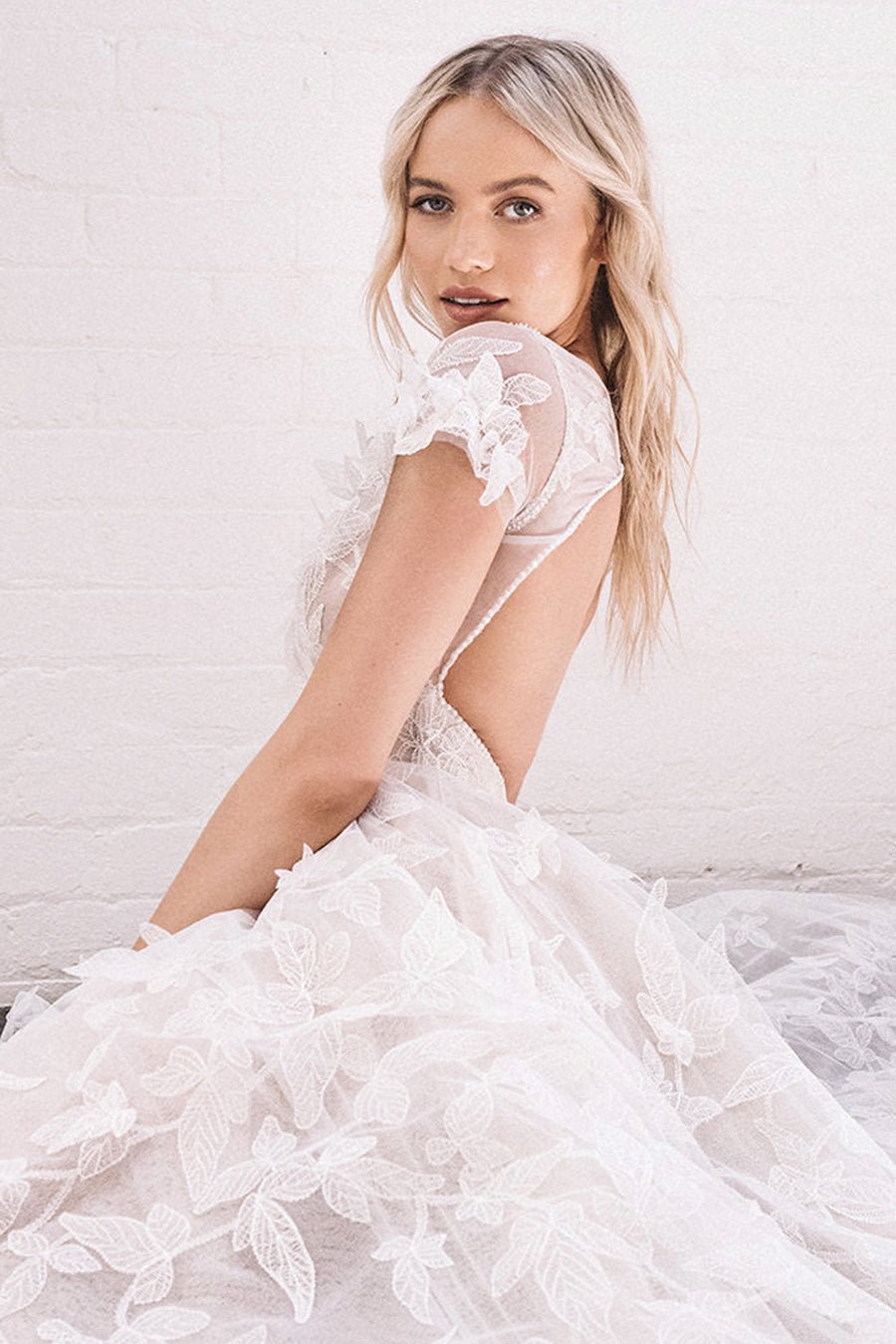 A romantic, light as air fantasy gown, Emilie has a sensuous cut out back, and pretty cap sleeves. The gown is strewn with abundant and delicate leaves of lace, creating movement and volume on a base of sheer silks.
